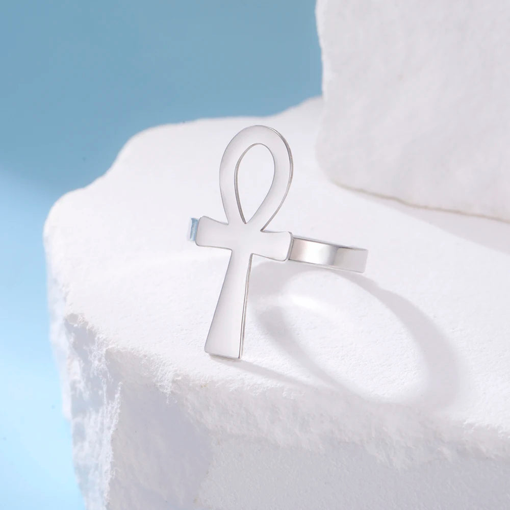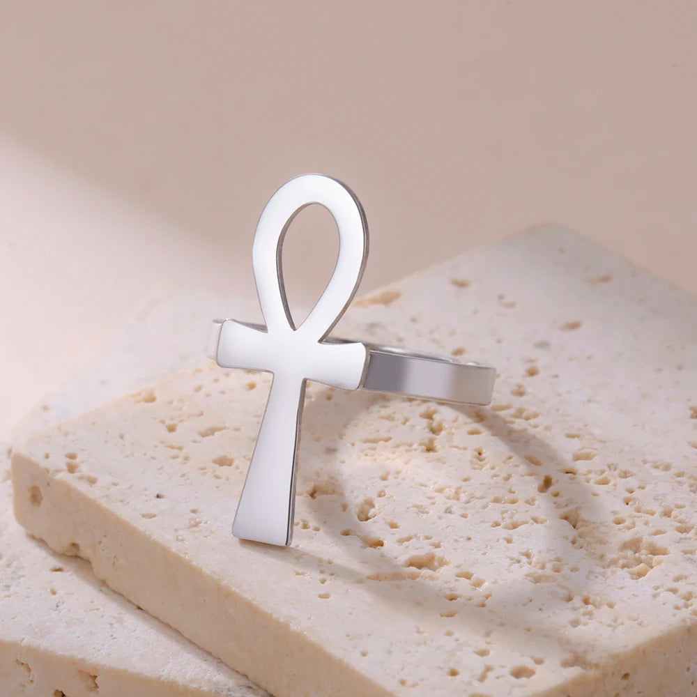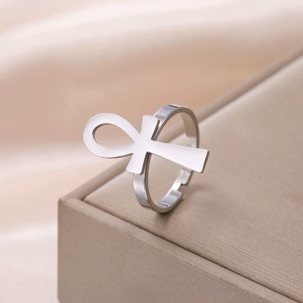 Bague égyptienne avec une croix Ankh réglable en acier inoxydable argent