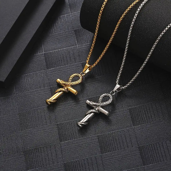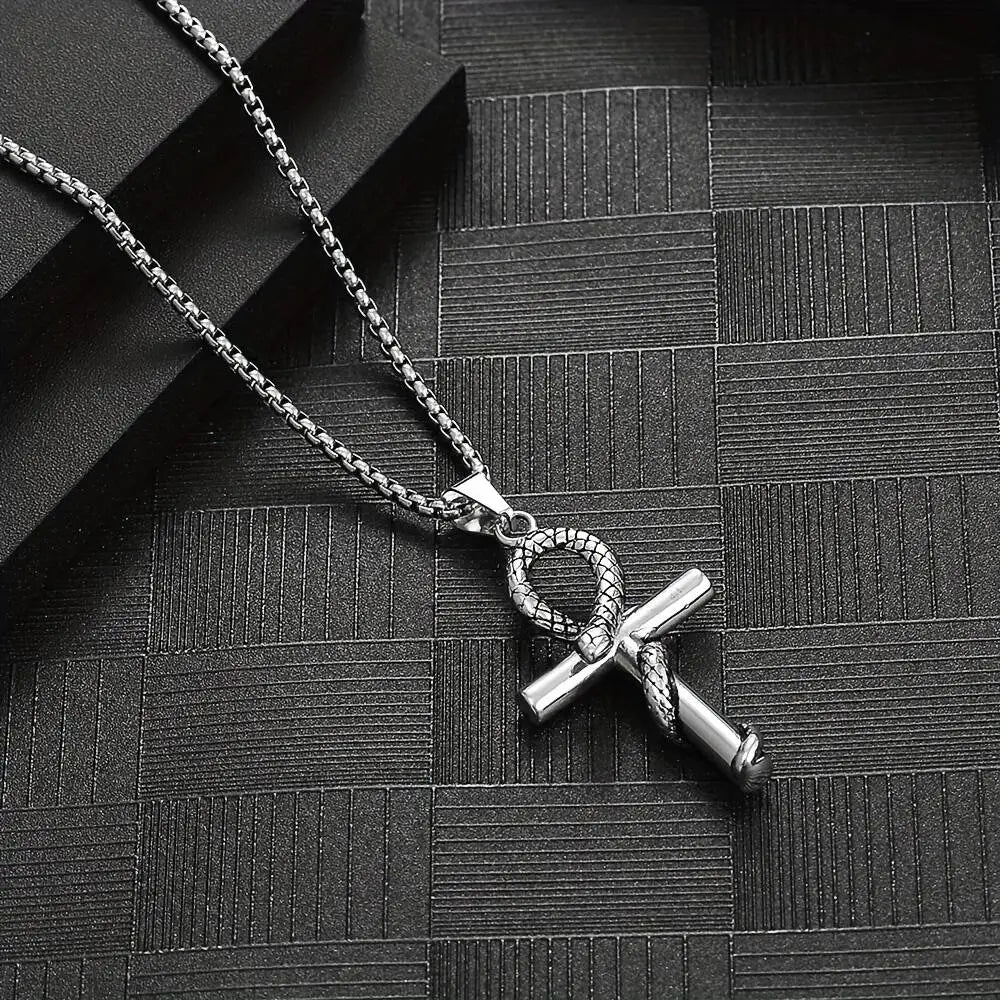 Collier égyptien serpent avec un pendentif croix Ankh en acier inoxydable argent