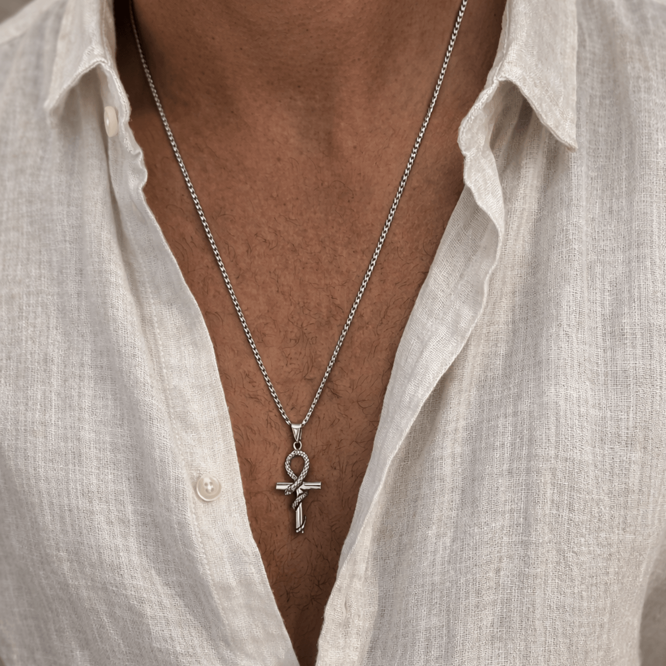 Symbole de vie éternelle et de renaissance, ce collier croix de vie Ankh en forme de serpent est un bijou égyptien intemporel qui sublime toutes vos tenues avec caractère. Porté en collier croix Ankh ou offert en cadeau, ce pendentif croix de vie serpent incarne à la perfection le mystère et la puissance de l'Égypte ancienne. Ce pendentif croix Ankh est fabriqué en acier inoxydable couleur argent : hypoallergénique, résistant à l'oxydation et sans entretien particulier, il vous accompagne au quotidien sans jamais ternir.