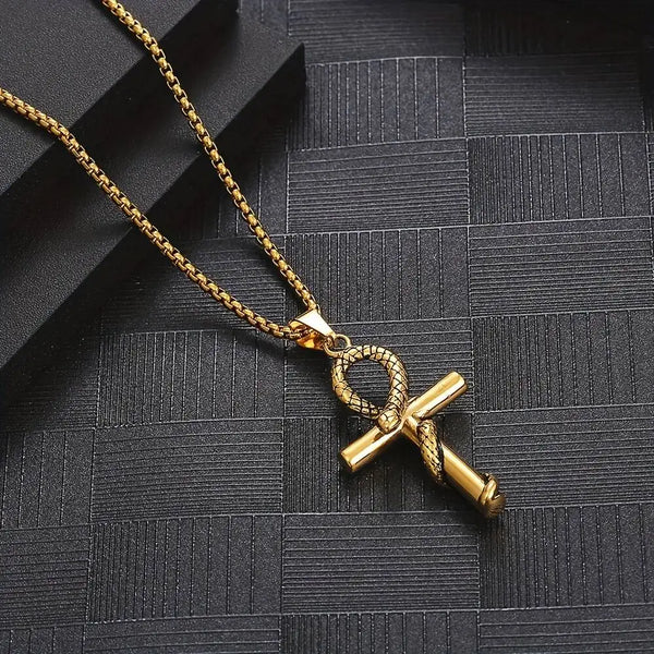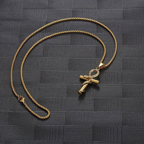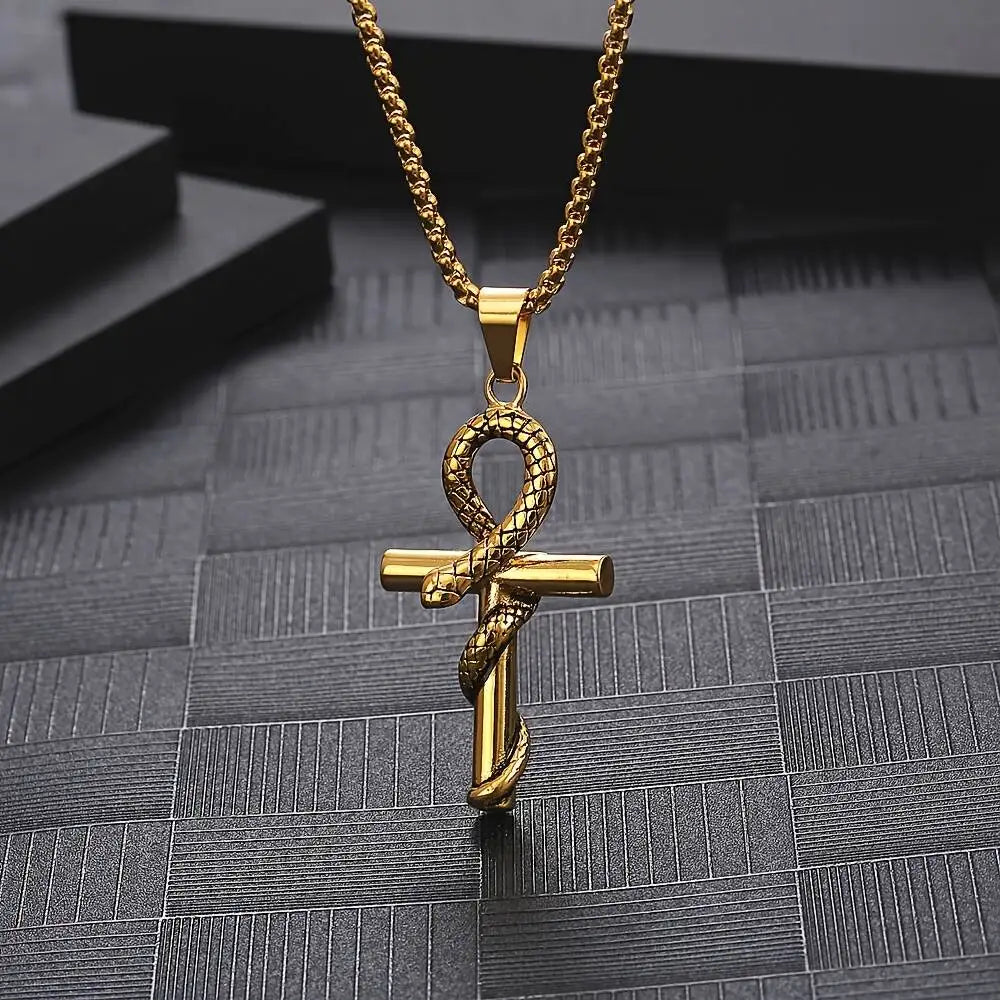 Collier égyptien serpent avec un pendentif croix Ankh en acier inoxydable or