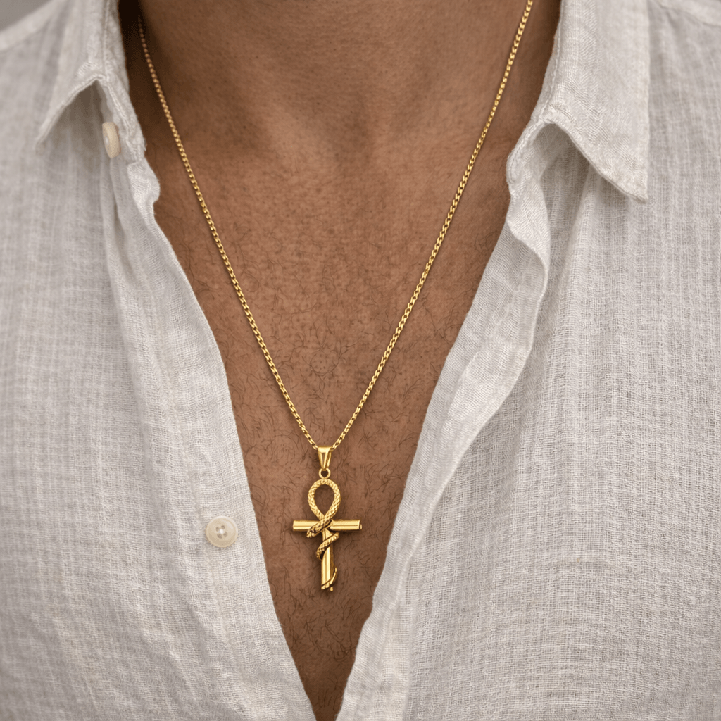 Symbole de vie éternelle et de renaissance, ce collier croix de vie Ankh en forme de serpent est un bijou égyptien intemporel qui sublime toutes vos tenues avec caractère. Porté en collier croix Ankh ou offert en cadeau, ce pendentif croix de vie serpent incarne à la perfection le mystère et la puissance de l'Égypte ancienne. Ce pendentif croix Ankh est fabriqué en acier inoxydable couleur or : hypoallergénique, résistant à l'oxydation et sans entretien particulier, il vous accompagne au quotidien sans jamais ternir.